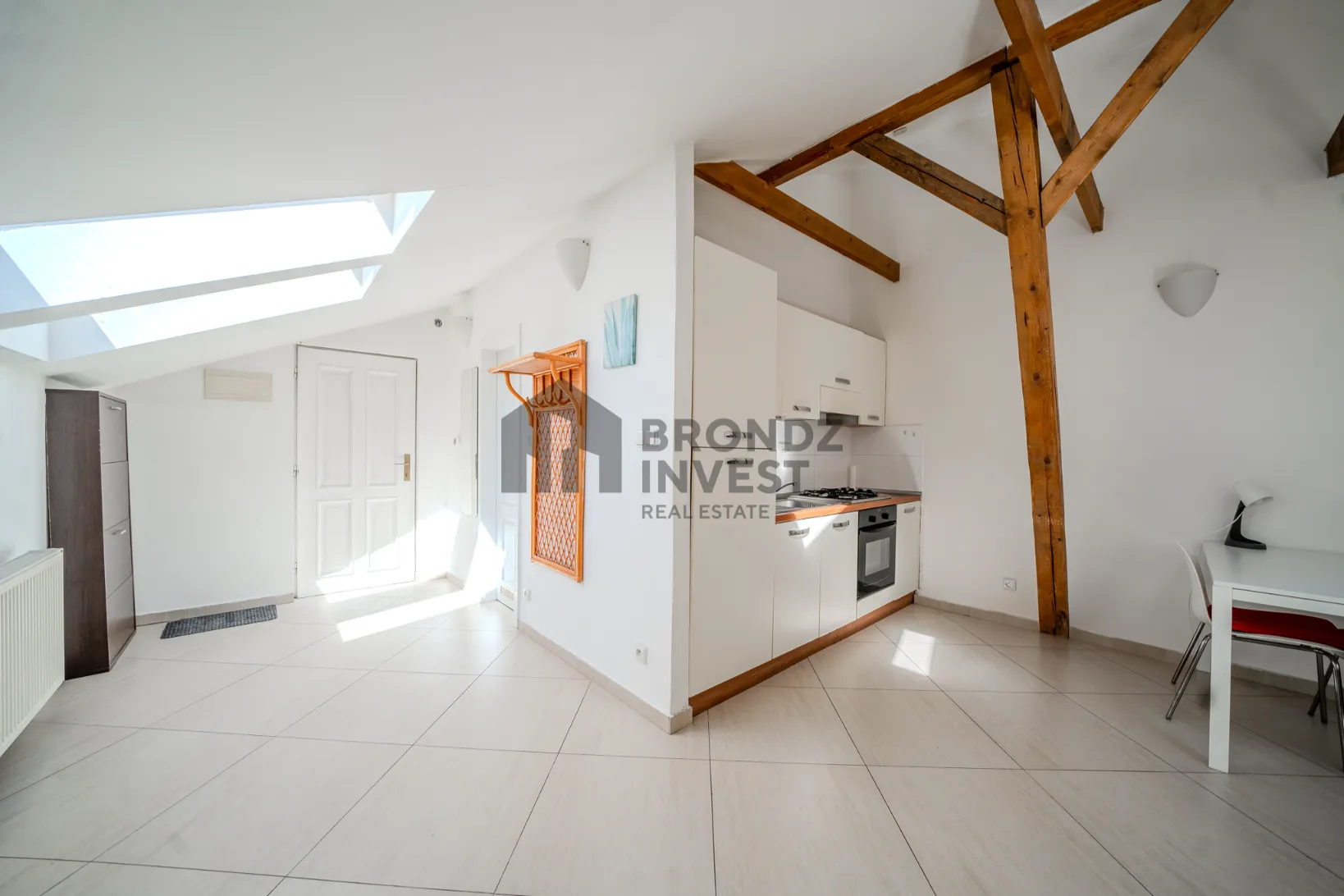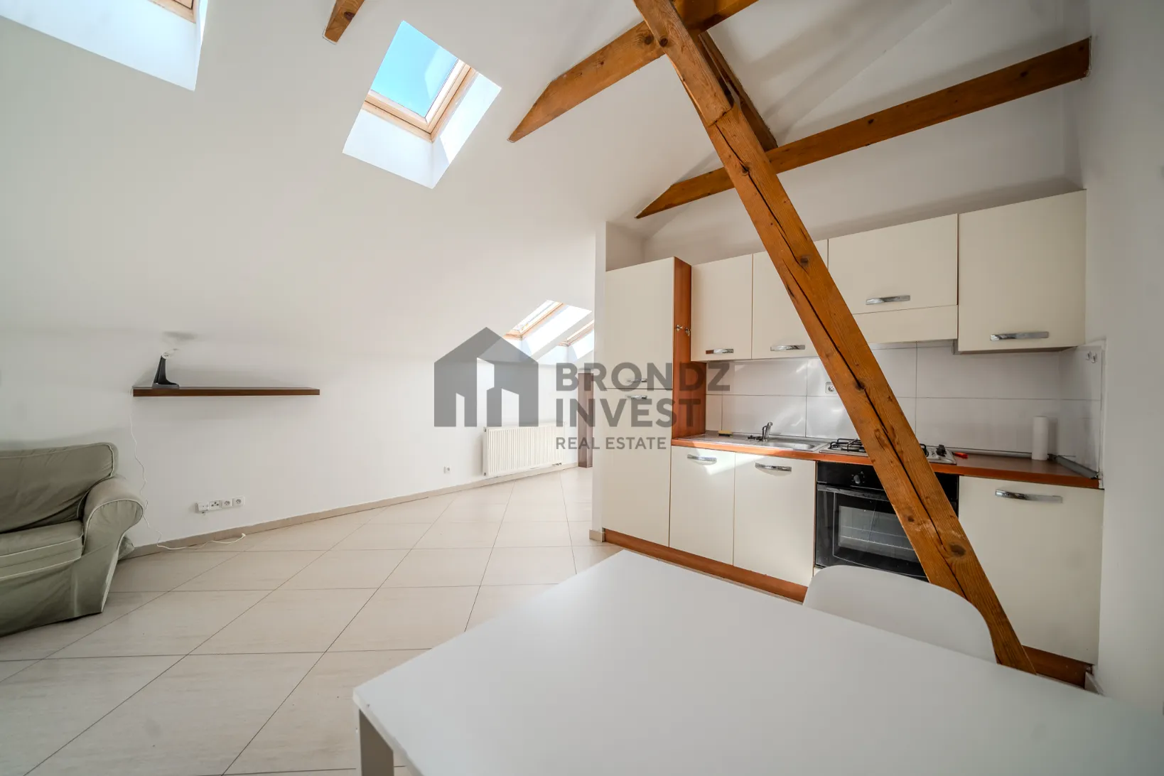 The apartment is fully furnished and equipped. It consists of a living room with a kitchen, a separated sleeping area, and a bathroom with a bathtub and toilet.